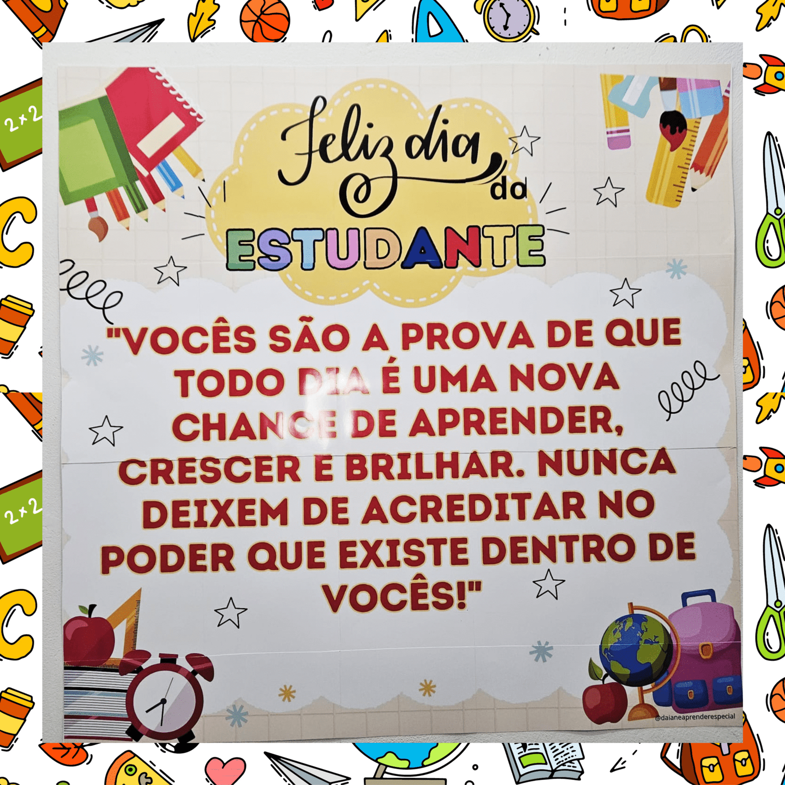 Este material foi criado para valorizar quem faz da escola um espaço de descobertas e sonhos: os estudantes! Com um painel temático pronto para imprimir e lembrancinhas fofas e inspiradoras, você transforma essa data em um momento especial de carinho e reconhecimento.