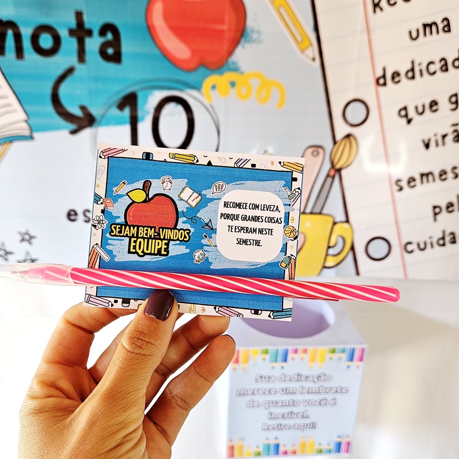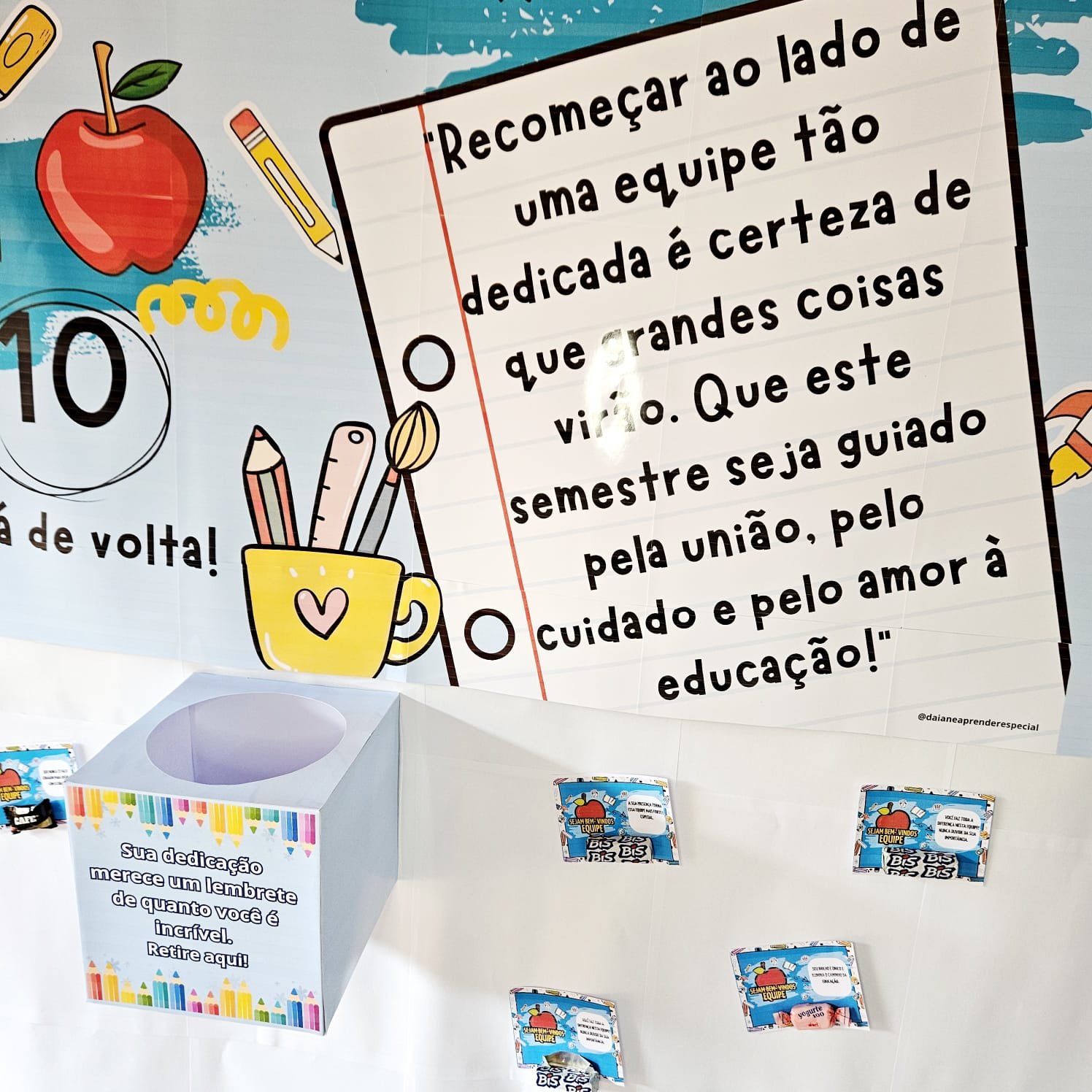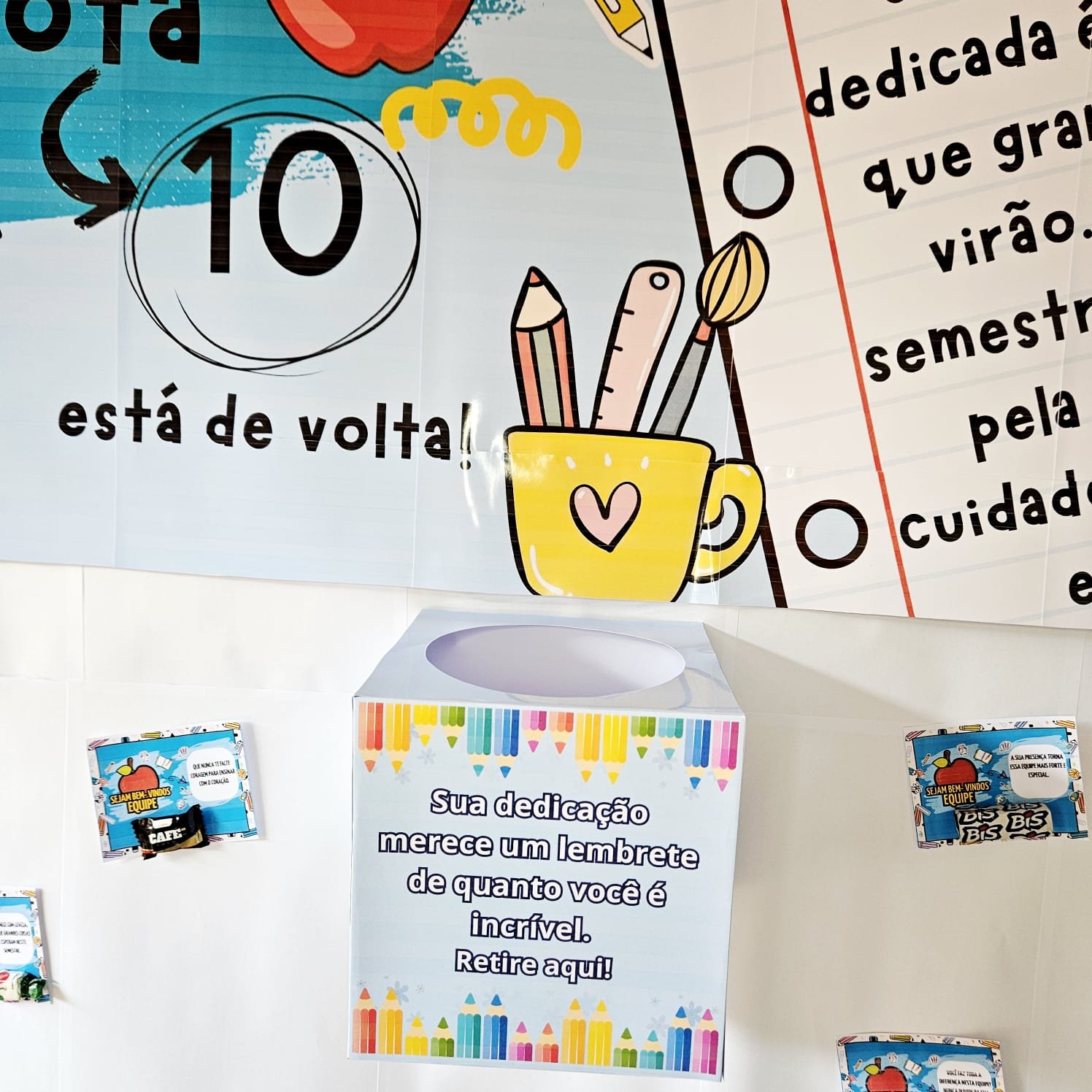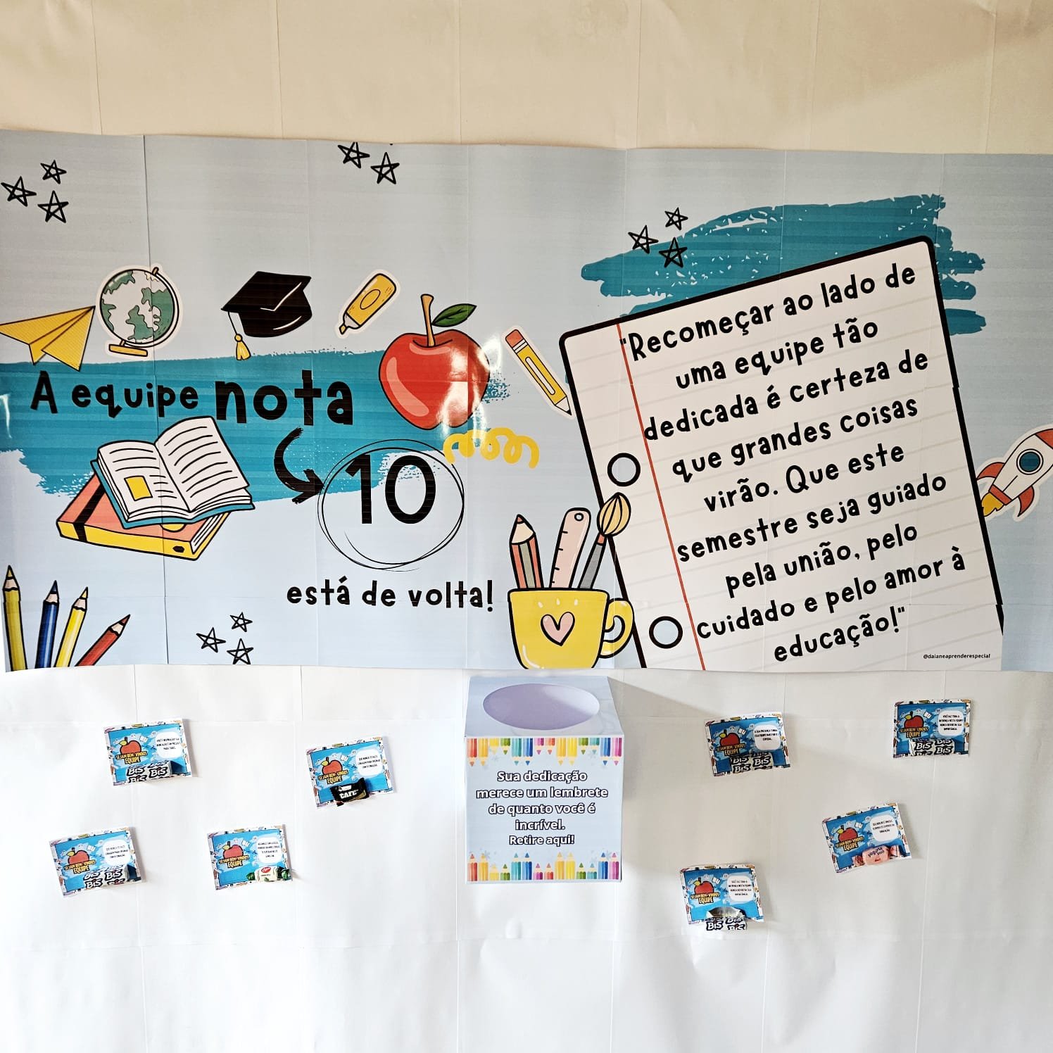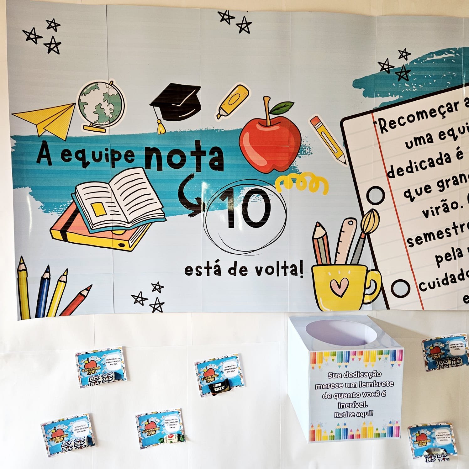Arquivo para download em PDF. Prepare-se para encantar sua equipe na volta do recesso! Nosso painel “A Equipe Nota 10 Está de Volta!” é a dose de motivação perfeita para recepcionar com carinho e entusiasmo quem faz a escola acontecer. Com um visual acolhedor, ele traz uma caixinha especial com mensagens motivacionais que podem ser em formato de raspadinha, tornando esse momento ainda mais divertido, interativo e inesquecível! Um detalhe que reacende a energia da equipe e valoriza cada profissional com afeto e inspiração.