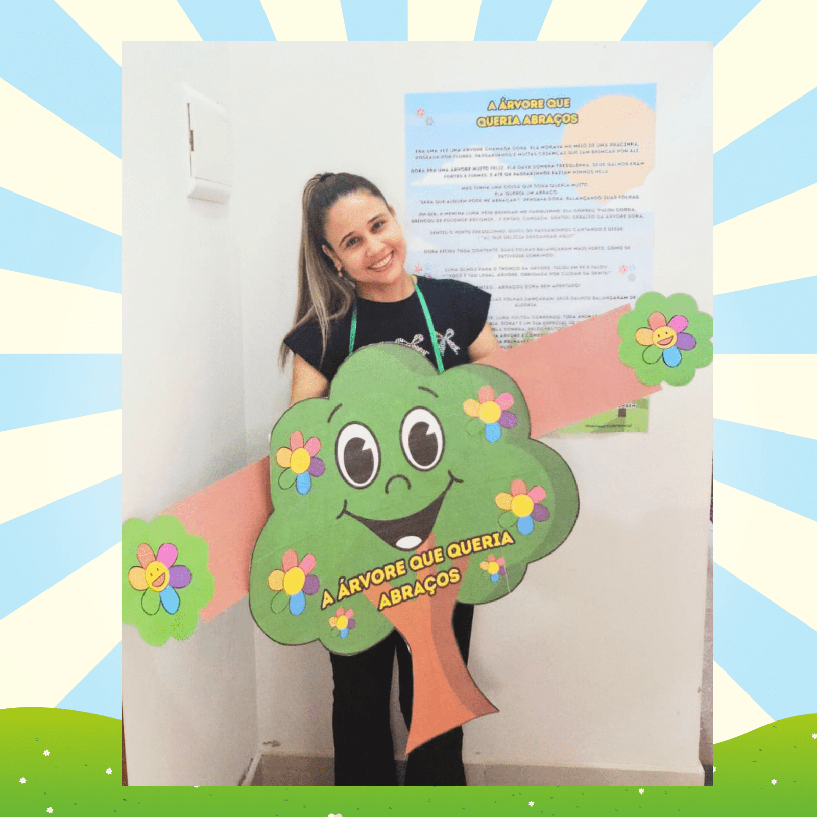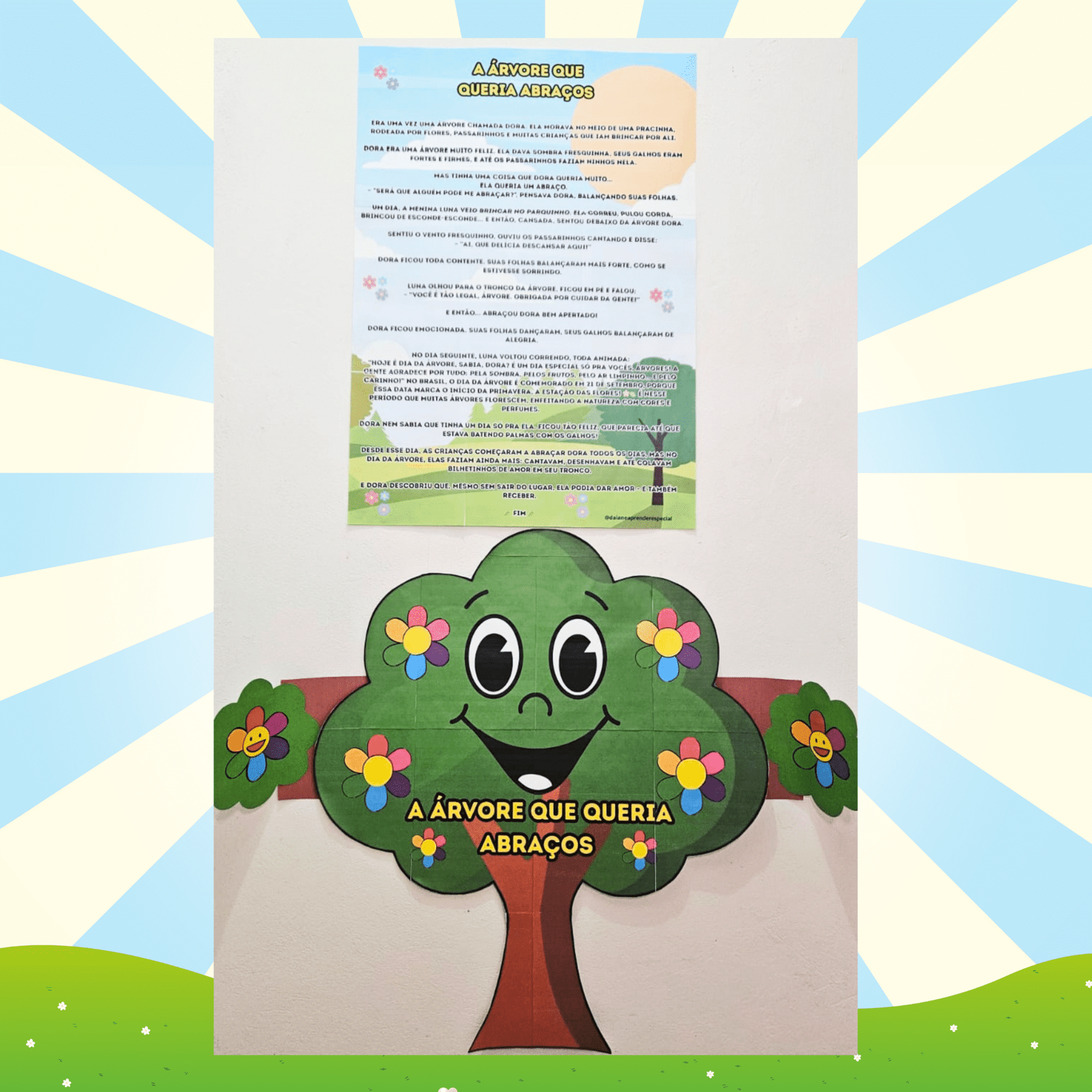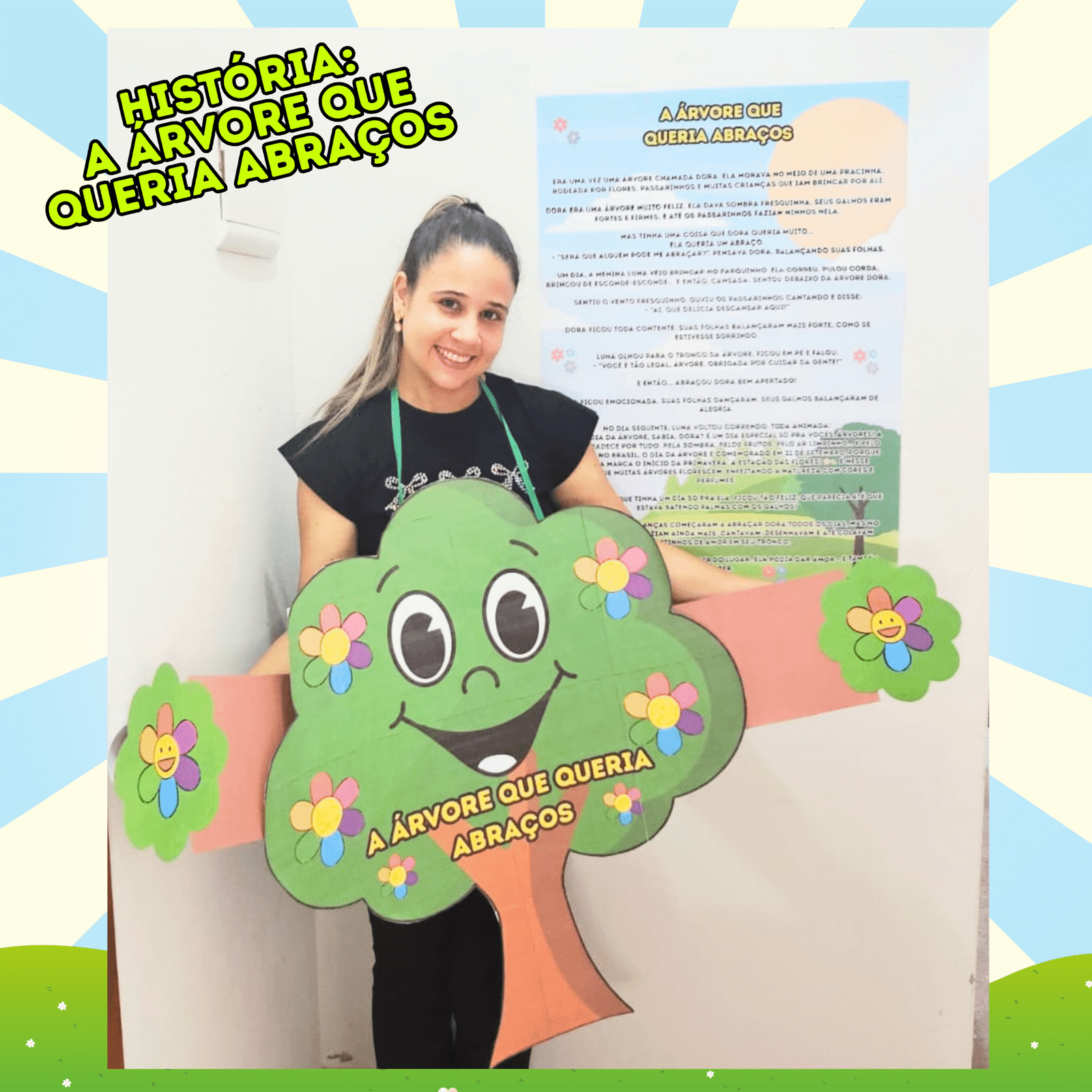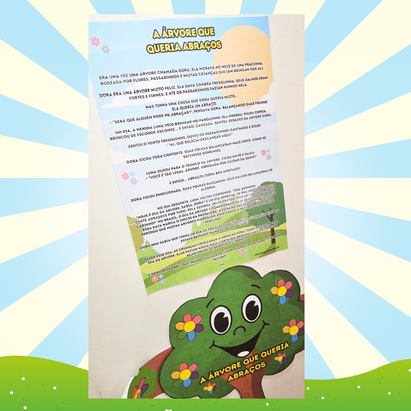 Encante sua turma no Dia da Árvore com este material especial e cheio de significado! Ele traz uma árvore ampliada com braços longos para abraços, perfeita para uma atividade interativa e afetiva com as crianças. Além disso, acompanha a história ampliada “A Árvore que Queria Abraços”, que transmite uma mensagem de cuidado e valorização da natureza, e um desenho para colorir, tornando a experiência ainda mais lúdica e divertida.