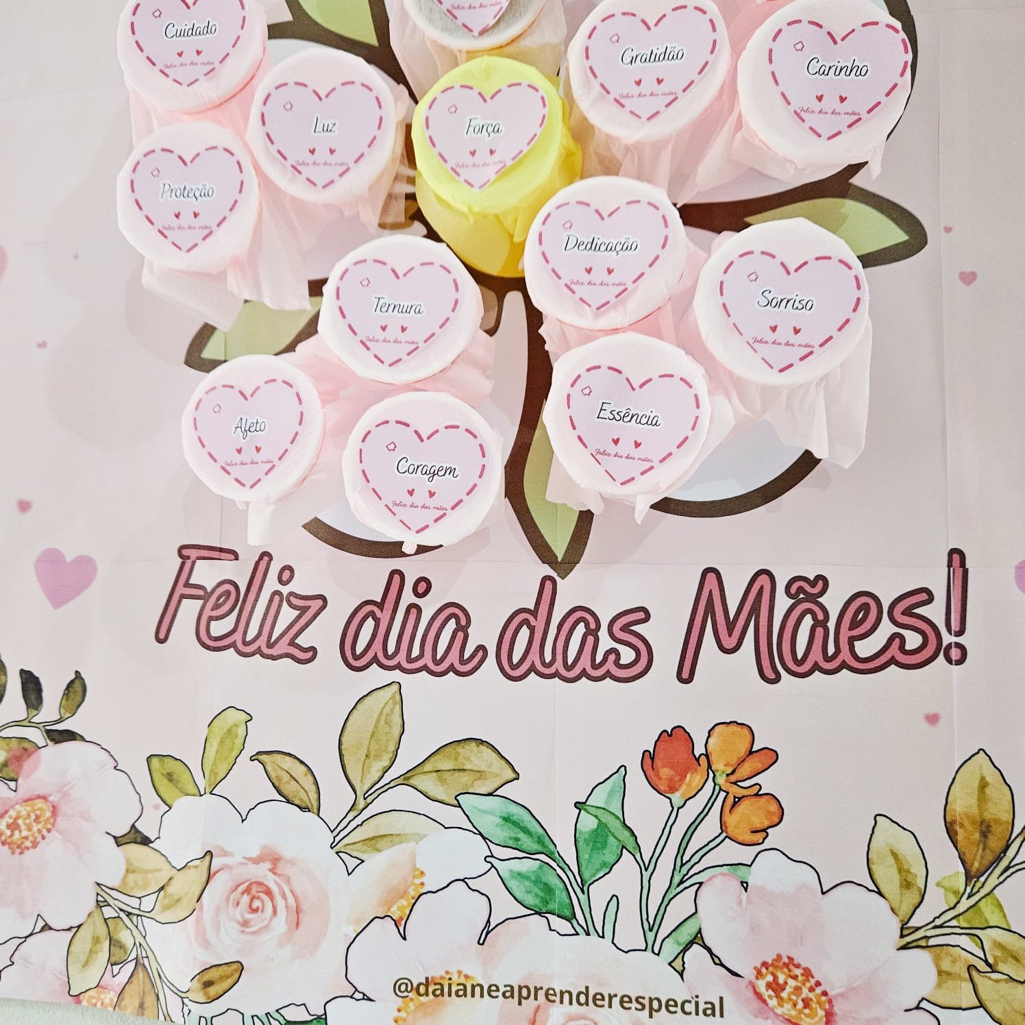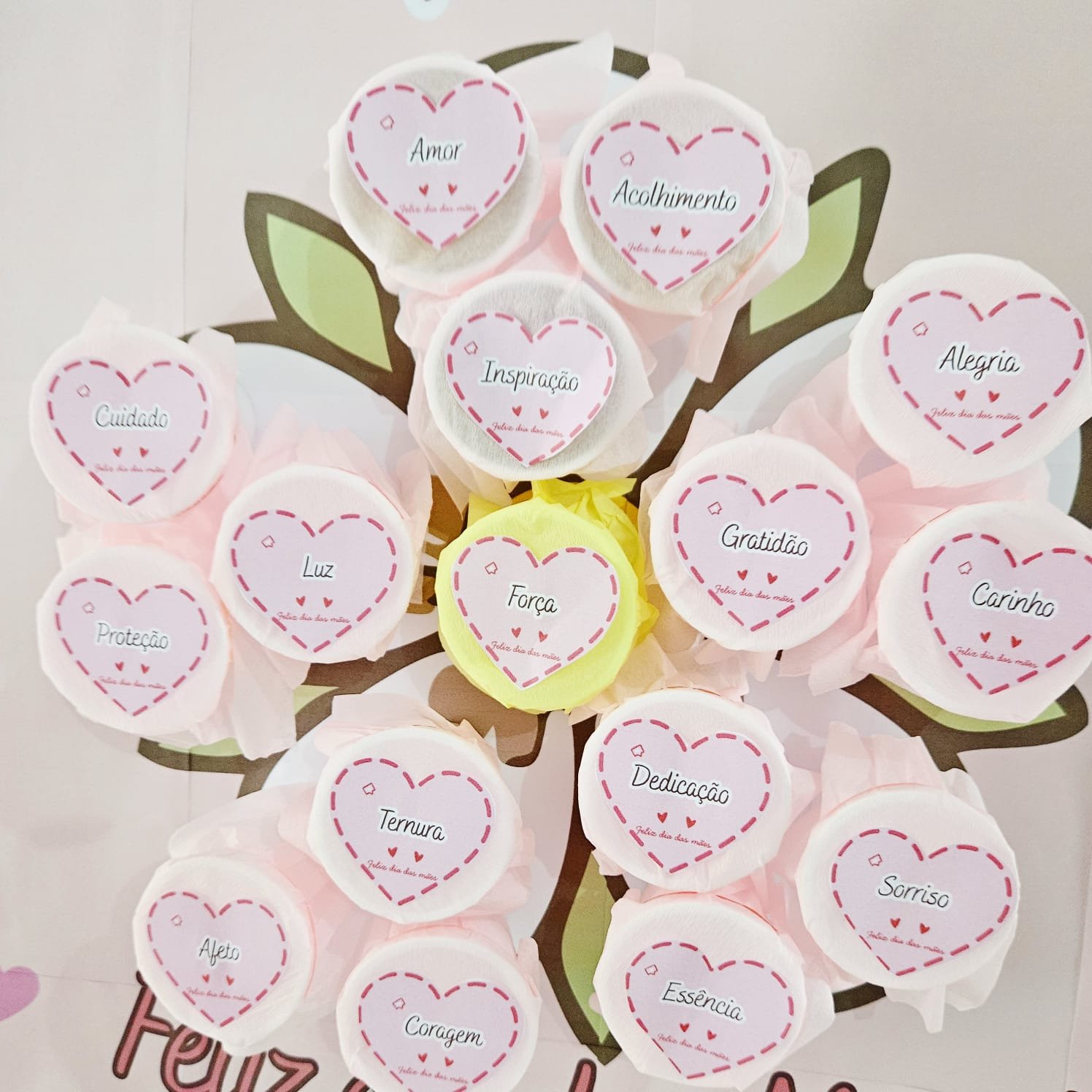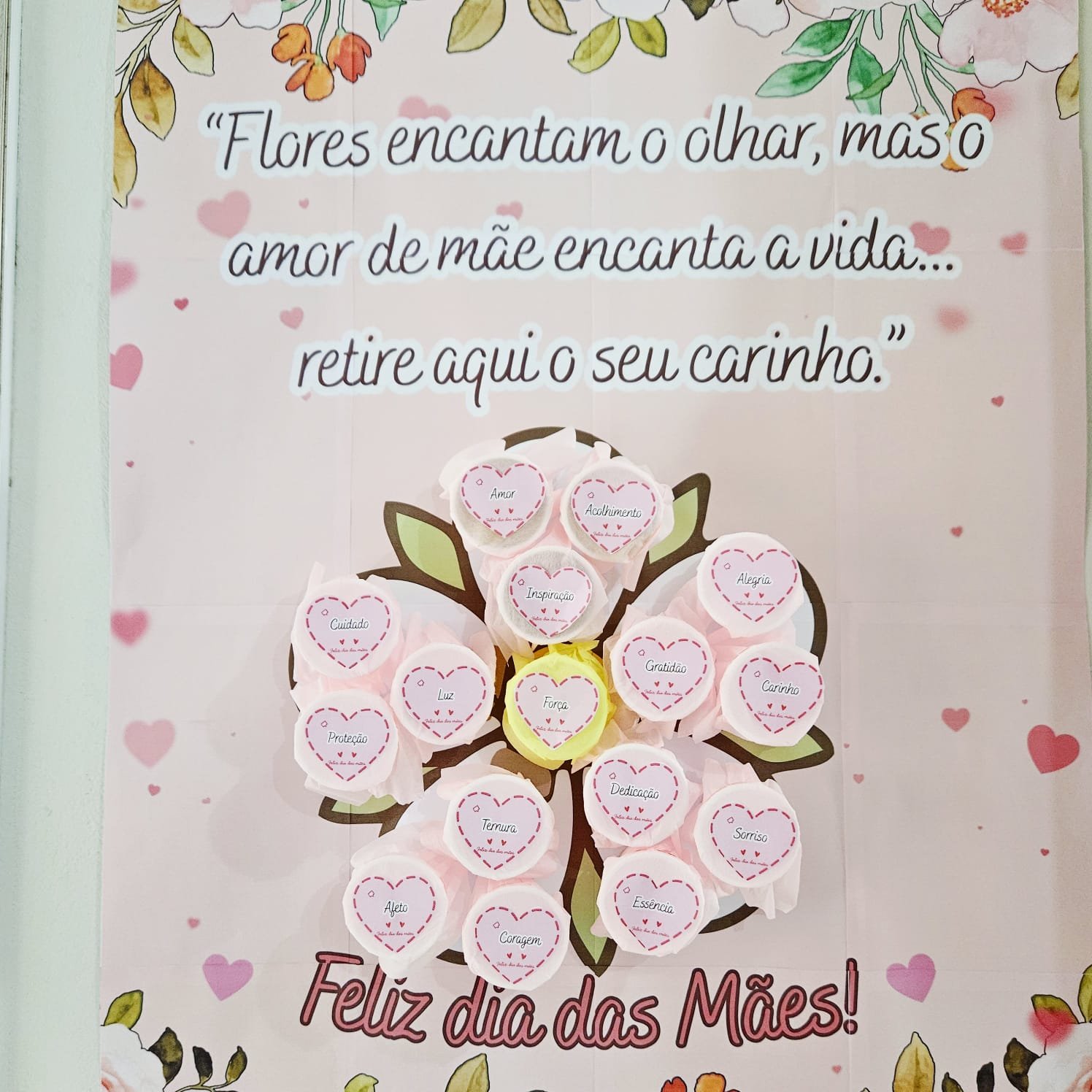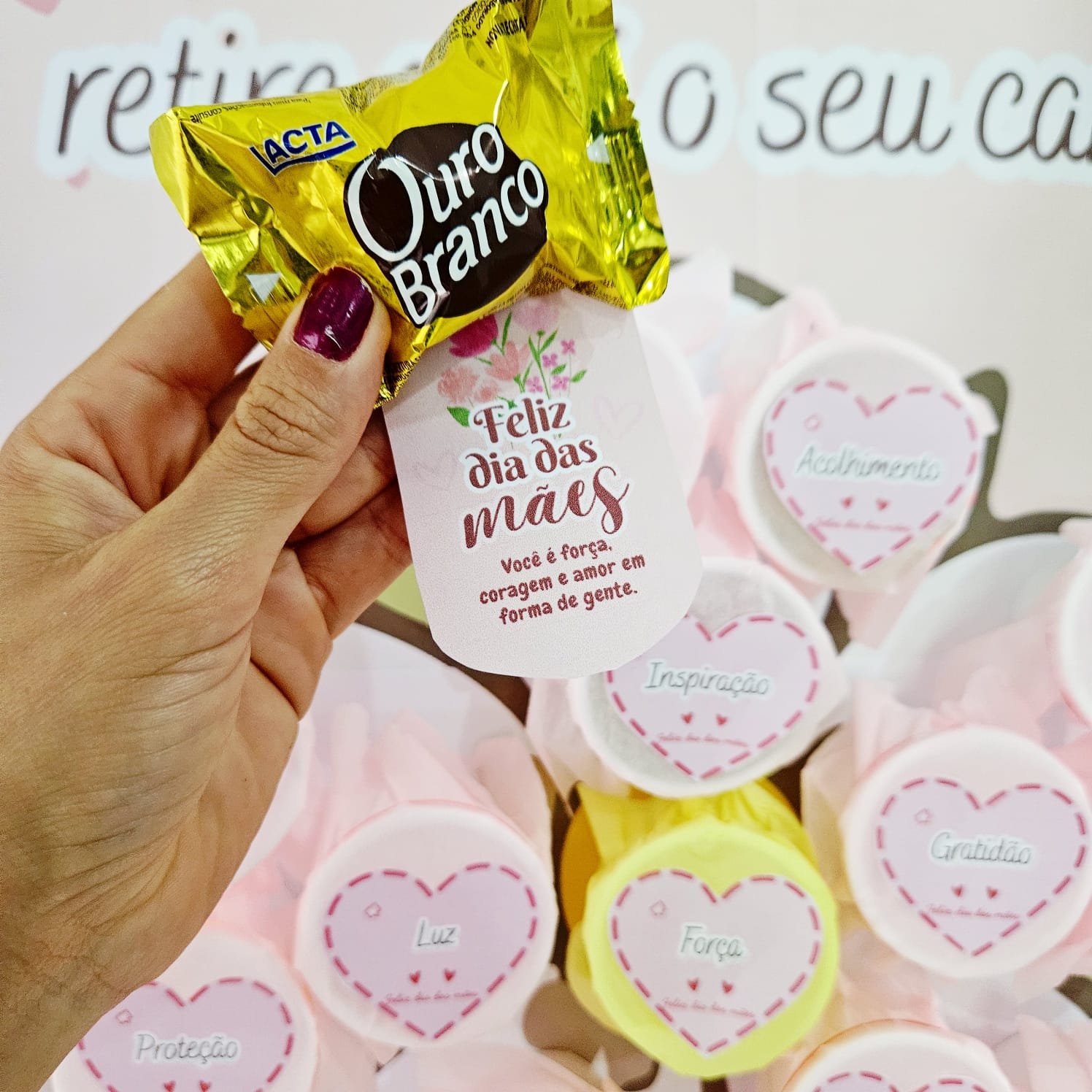 Apresentamos um painel encantador, pensado para acolher cada mãe com amor e delicadeza. A proposta é simples, mas cheia de significado: um lindo painel com uma frase especial e copinhos fixados, cada um com um doce e uma mensagem motivacional.
