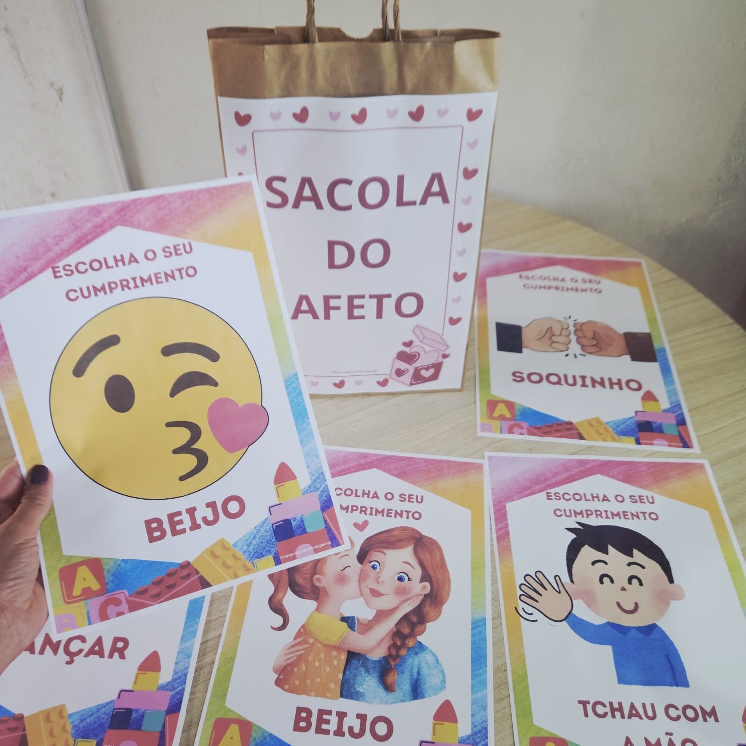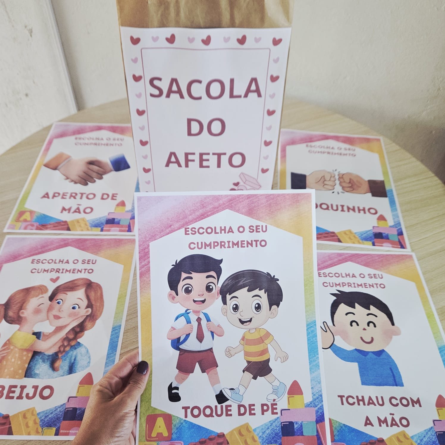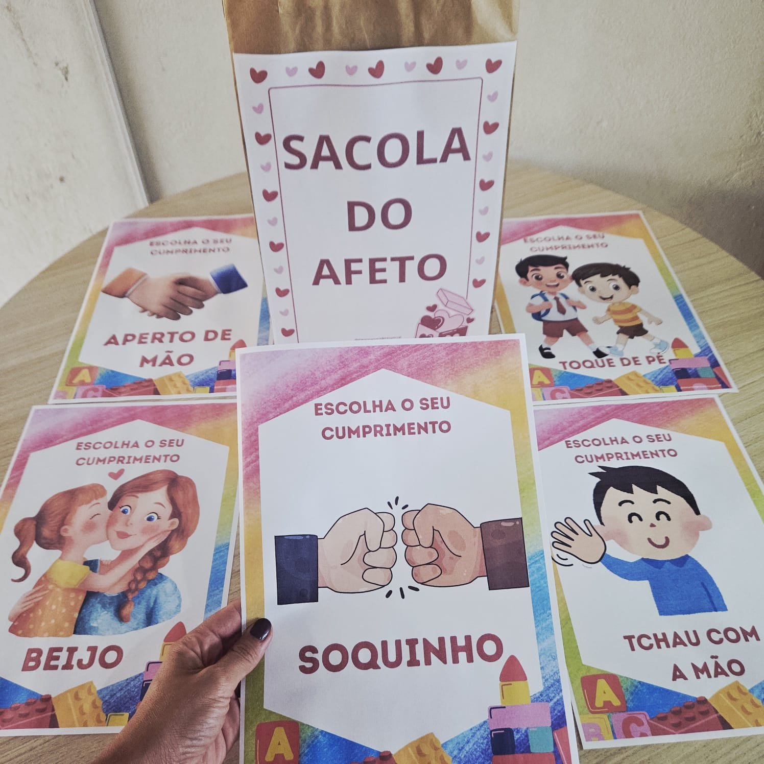 A proposta é simples e encantadora: a professora apresenta as opções de cumprimentos e as crianças escolhem uma das 7 opções de cumprimentos para interagir com os colegas, promovendo vínculos, respeito e pertencimento.