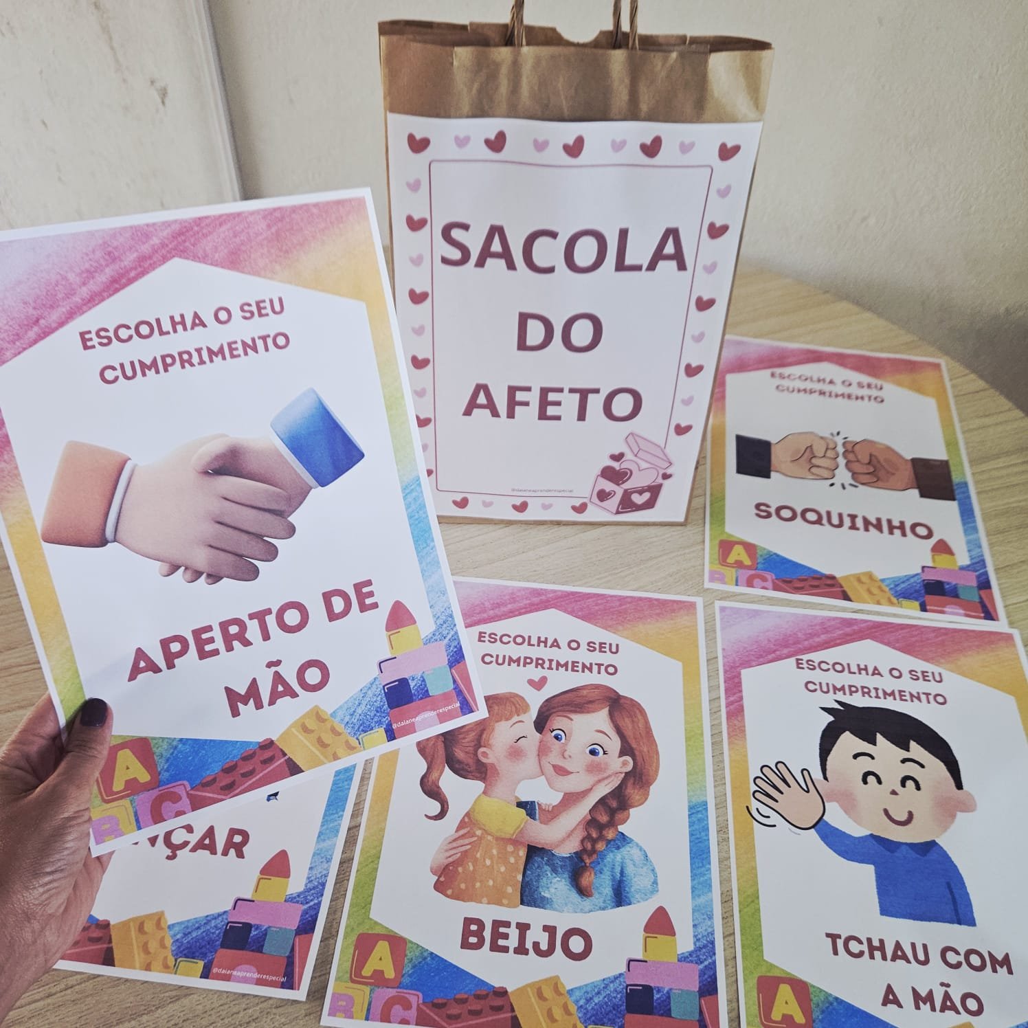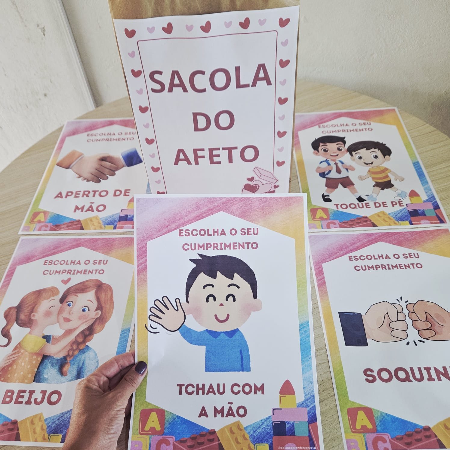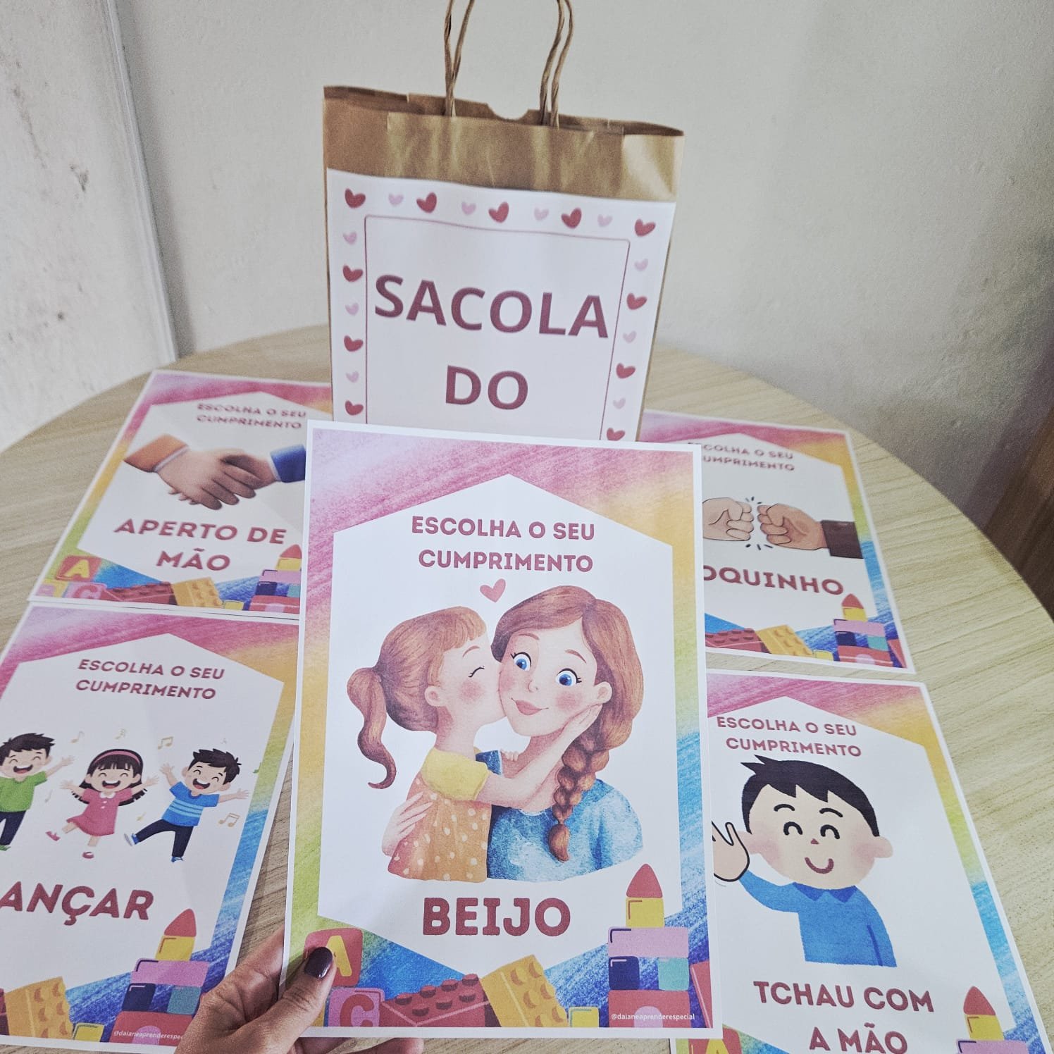 A proposta é simples e encantadora: a professora apresenta as opções de cumprimentos e as crianças escolhem uma das 7 opções de cumprimentos para interagir com os colegas, promovendo vínculos, respeito e pertencimento.